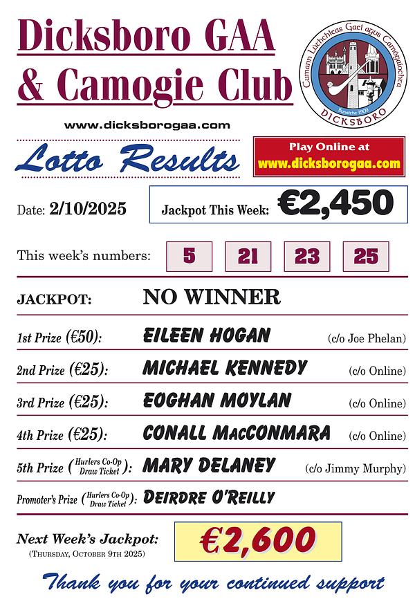 We encourage all Dicksboro families to sign up and play weekly for just €2 per draw and we thank everyone who is currently doing so.