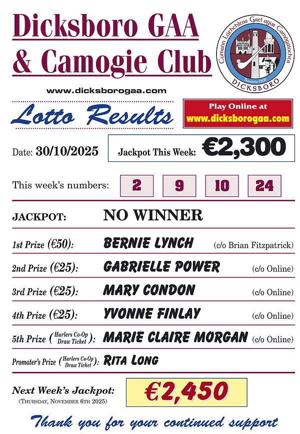 We encourage all Dicksboro families to sign up and play weekly for just €2 per draw and we thank everyone who is currently doing so.