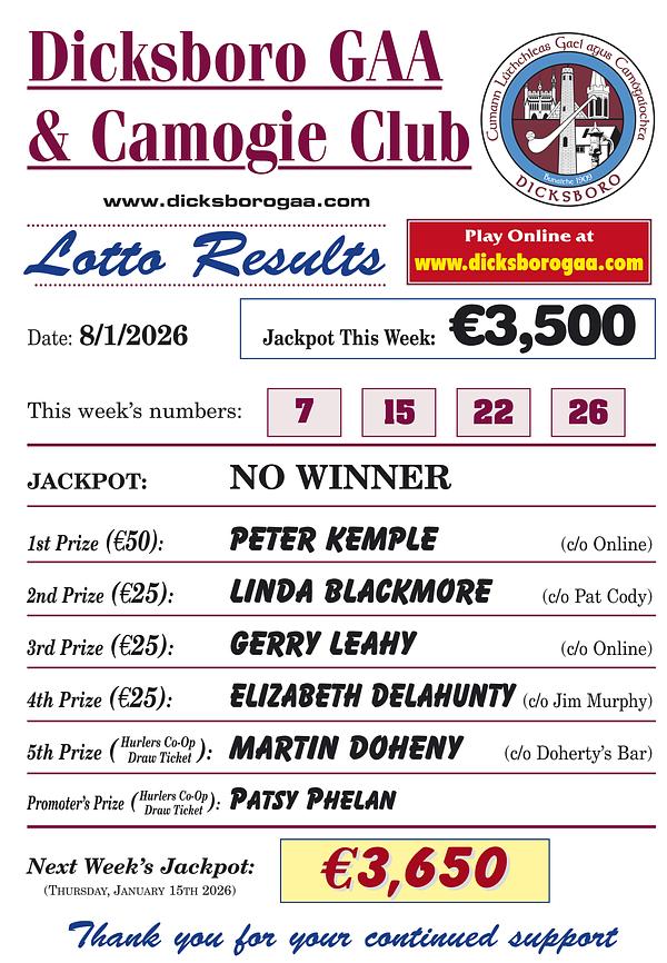 We encourage all Dicksboro families to sign up and play weekly for just €2 per draw and we thank everyone who is currently doing so.