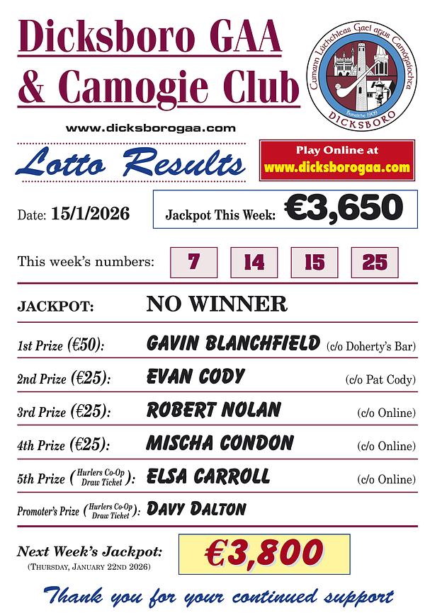 We encourage all Dicksboro families to sign up and play weekly for just €2 per draw and we thank everyone who is currently doing so.