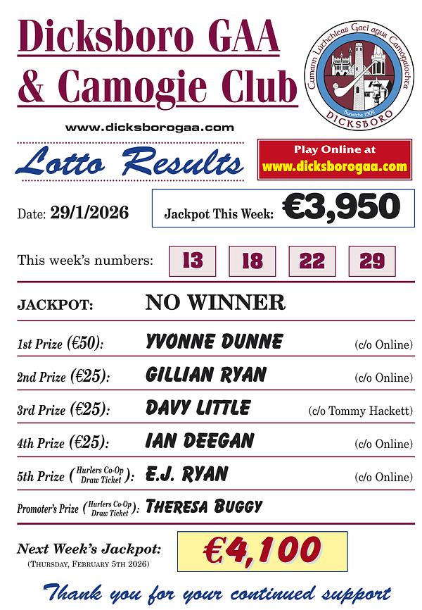 We encourage all Dicksboro families to sign up and play weekly for just €2 per draw and we thank everyone who is currently doing so.