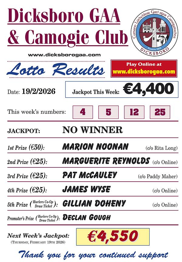 We encourage all Dicksboro families to sign up and play weekly for just €2 per draw and we thank everyone who is currently doing so.