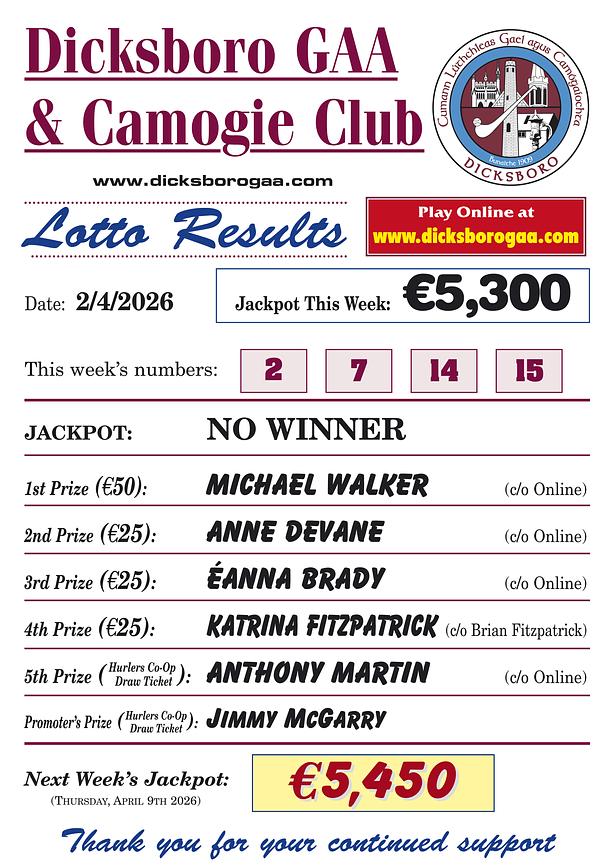 We encourage all Dicksboro families to sign up and play weekly for just €2 per draw and we thank everyone who is currently doing so.