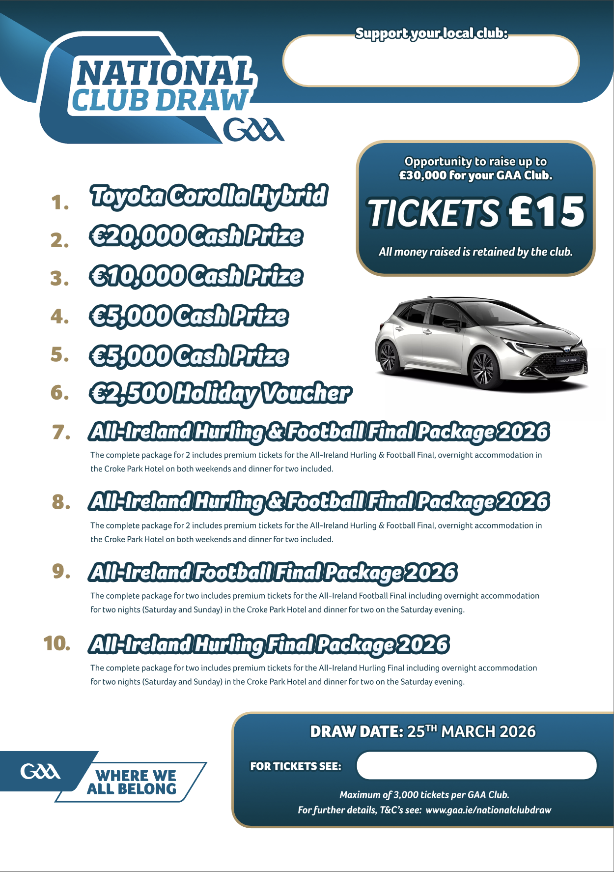There are fantastic prizes on offer including a brand-new car, major cash prizes and All-Ireland Final packagesโฆ and best of all every euro raised stays with our club to help improve facilities and support our players.