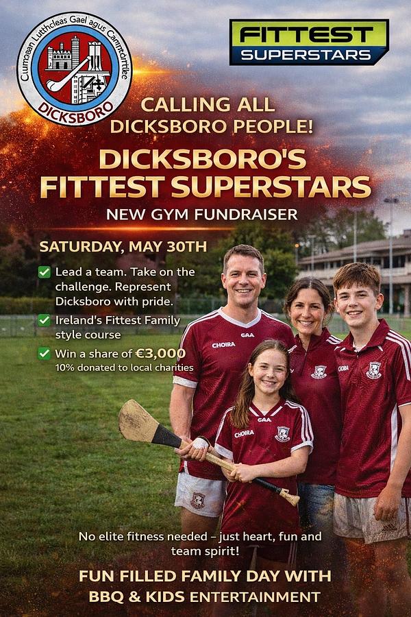 This is a fun, team-based challenge inspired by Ireland’s Fittest Family, with Davy Fitz and his team coming to Palmerstown — built around teamwork, laughs and community. A training plan can be provided if you want one, and the course is designed so ordinary club people can take part and enjoy it.